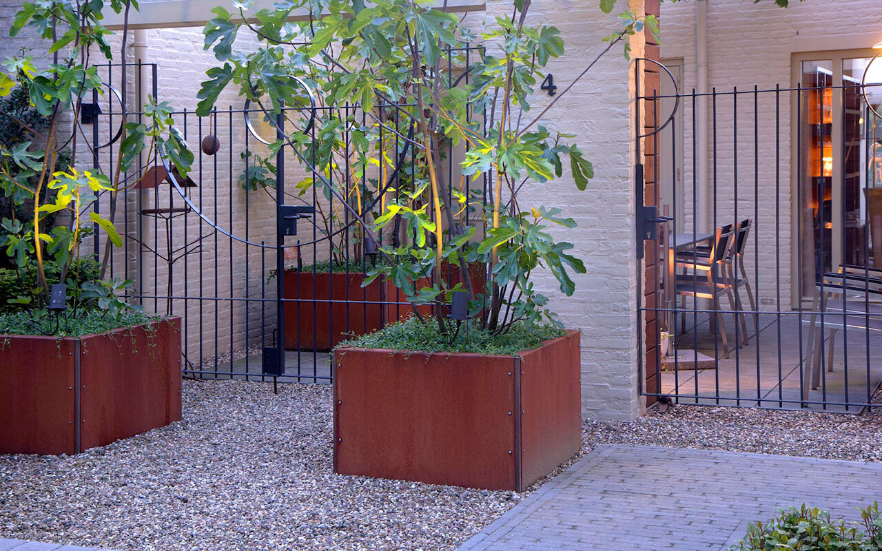 Cortenstaal speelt hierin een belangrijke rol. De warme roestkleur contrasteert mooi met het groen en de lichte gevels van de woning. Tegelijk zorgen de bloembakken voor hoogteverschil en duidelijke zones in de tuin.